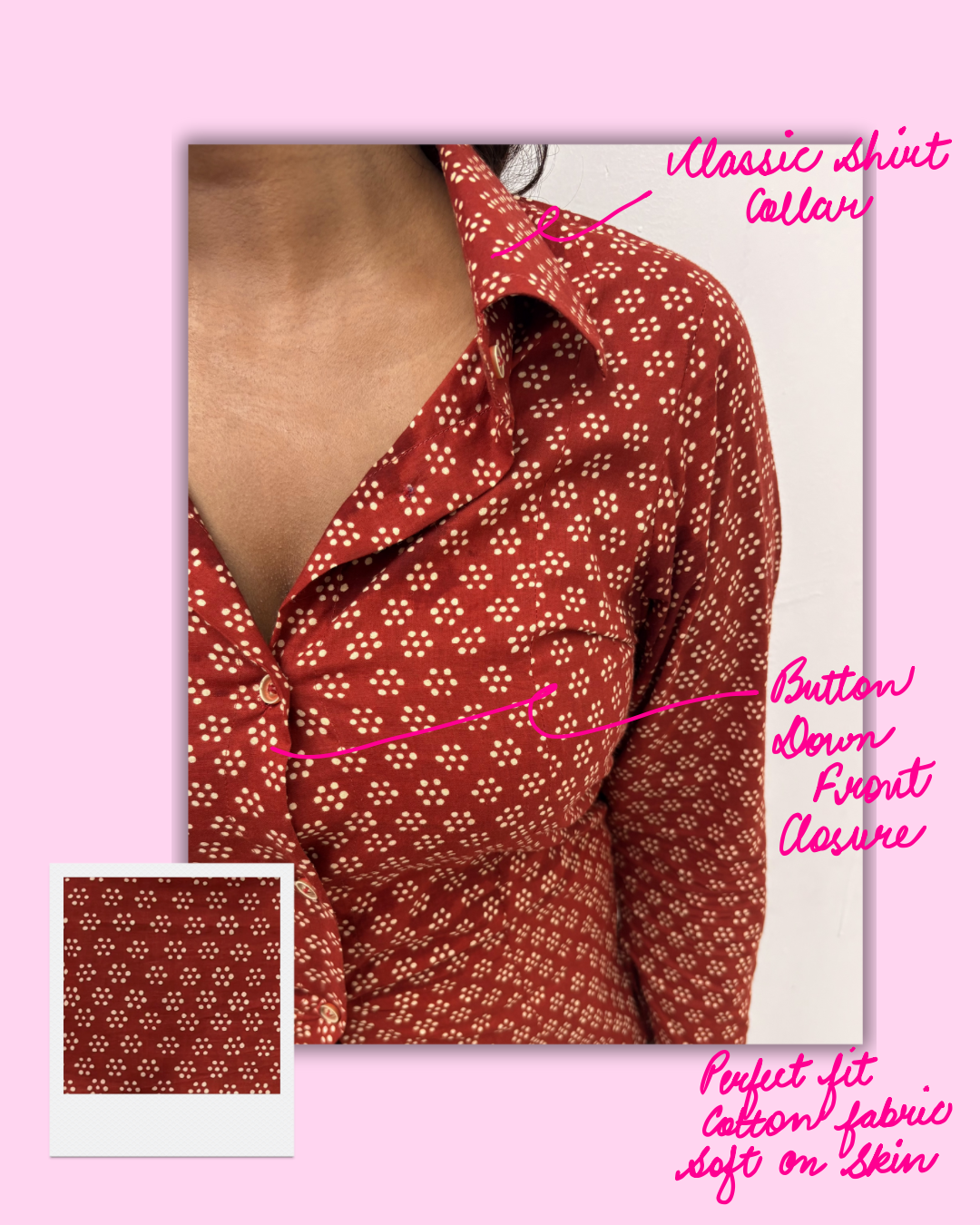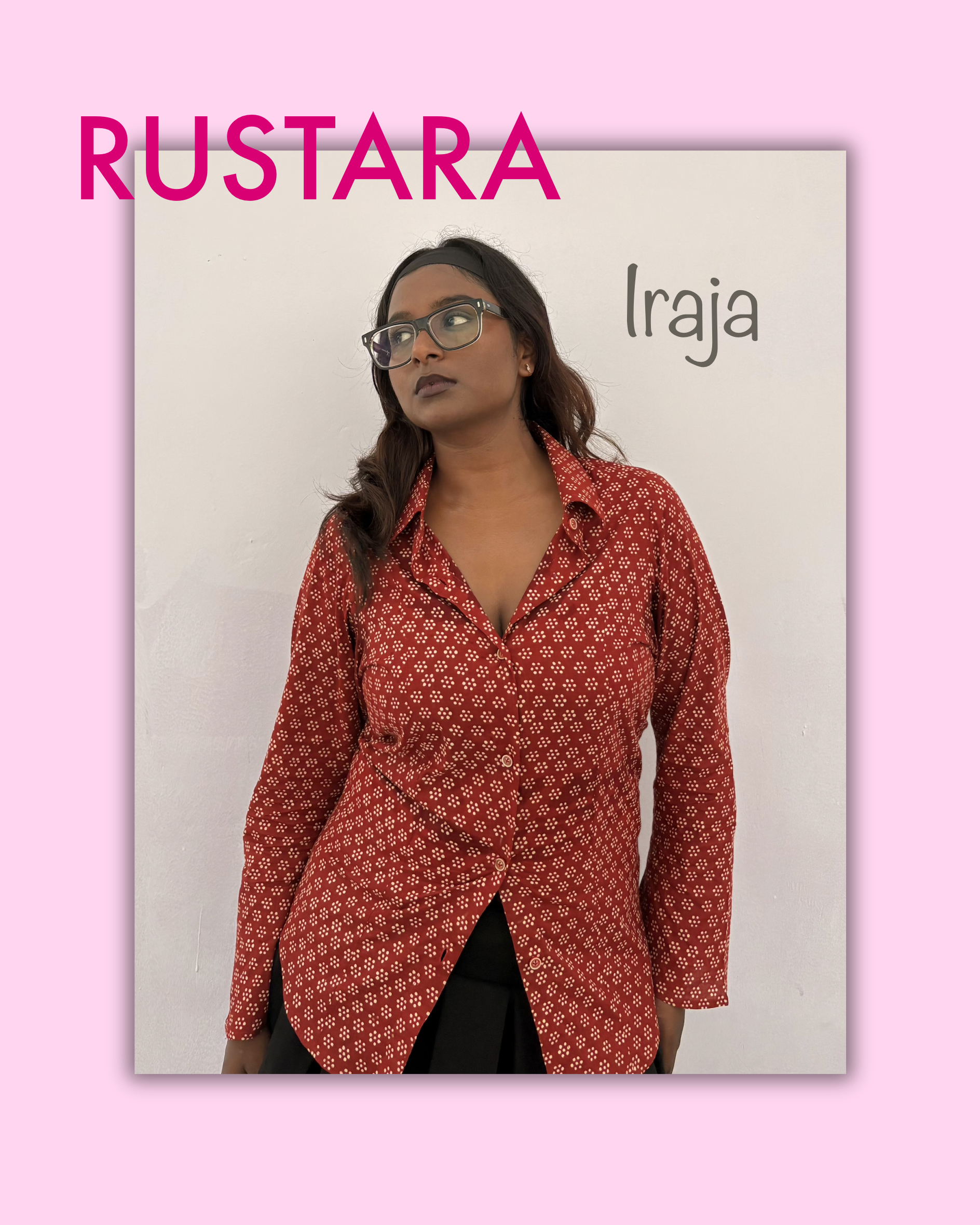 Ira is where structure meets style. Designed in breathable cotton with an earthy rust base and delicate geometric print, this shirt redefines everyday dressing. The cinched adjustable waist at the back adds shape and definition, while the collared neckline keeps it smart yet playful. A versatile piece that pairs effortlessly with skirts, trousers, or denims—making it a wardrobe essential for college, work, or casual outings.