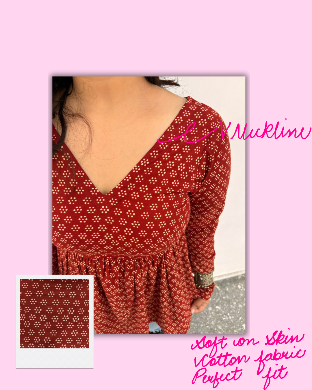 Meher is your go-to everyday peplum kurti designed to flatter every body type. Crafted in soft cotton with an earthy rust base and all-over geometric print, it blends comfort with effortless style. The gathered waist and flared hem give it a playful silhouette, while the V-neckline adds a touch of elegance. Perfect for casual outings, college wear, or laid-back festive days.